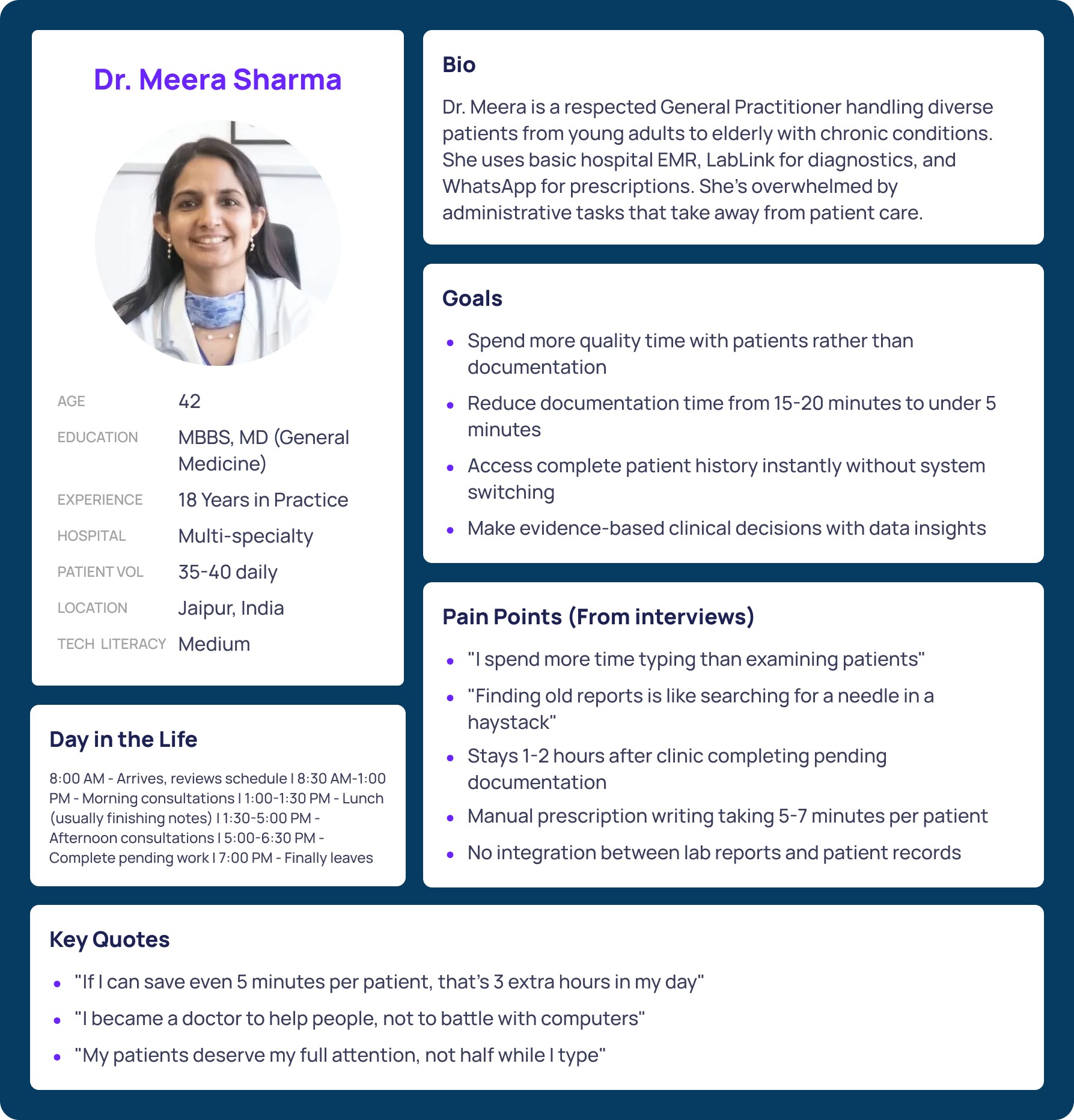Spent 40+ hours shadowing healthcare professionals across 3 hospitals in Jaipur and Delhi, observing real-time workflows during patient consultations, administrative tasks, and system interactions.